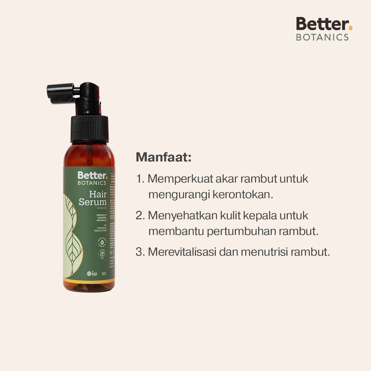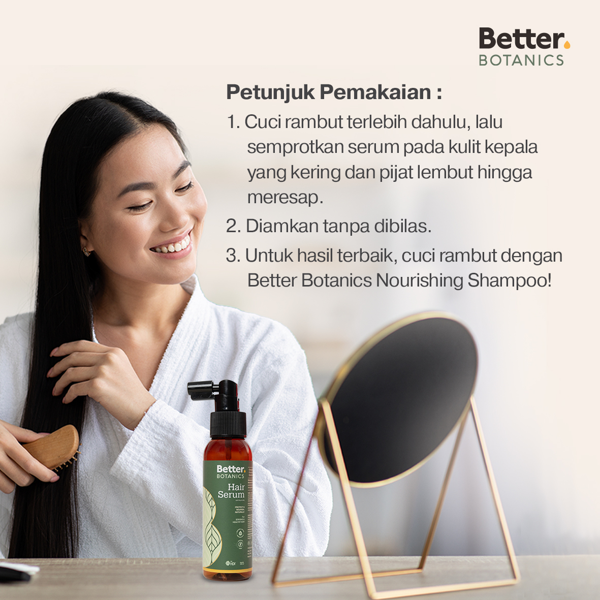 • Semprotkan Better Botanics Hair Serum ke kulit kepala setelah keramas.